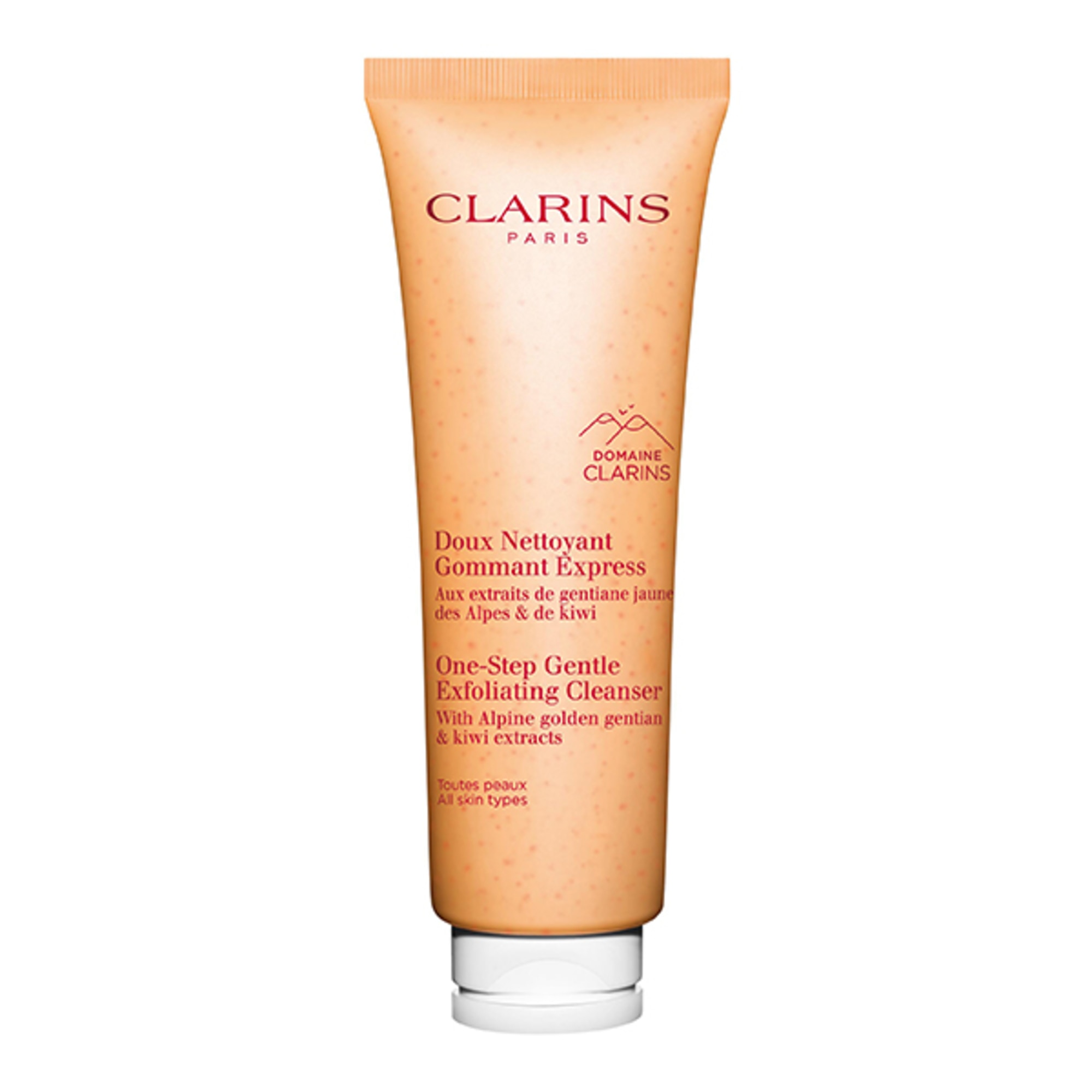 Clarins One-Step Gentle Exfoliating Cleanser este un produs de curatare 3 in 1, bogat in extracte de plante alpine de la Domaine Clarins, demachiaza, curata si exfoliaza toate tipurile de ten intr-un singur pas, mentinand in acelasi timp un ten echilibrat. Bogat in extracte organice de sapun si kiwi, lasa pielea curata, proaspata si radianta. Complexul Clarins [Gentle Complex], cu extracte de gentiana galbena bio si melissa bio, ajuta la calmarea si inmuierea pielii. Acest gel proaspat imbogatit cu microperle vegetale se transforma intr-o spuma usoara si cremoasa. Un usor efect de "peeling" lasa pielea delicat moale si clara dupa clatire.