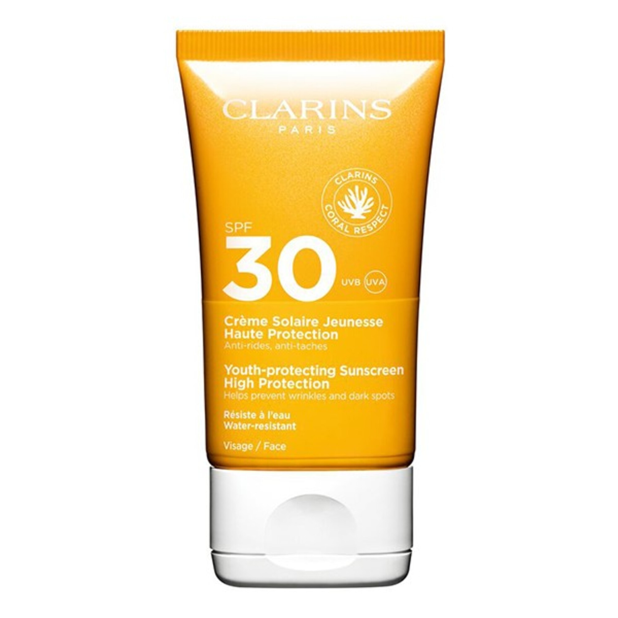 Ingrijirea solara anti-imbatranire de la Clarins ofera protectie de inalta performanta impotriva fotoimbatranirii. Crema solara hidratanta cu SPF 30 pentru fata, cu o textura fina si fondanta, ofera un finisaj mat, rezistent la apa. Aceasta crema antirid si anti pete intunecate are grija de pielea ta si este potrivita pentru toate tipurile de piele. Secretul sau consta in Multi-protectia exclusiva Clarins, cu doua complexe ce pastreaza frumusetea tinereasca a pielii: SUN FILTER COMPLEX, o combinatie de filtre solare pentru protectie optima impotriva razelor UVA/UVB, si SUN PLANT COMPLEX, o combinatie de 6 extracte de plante pentru prevenirea semnelor vizibile de fotoimbatranire si deshidratare.