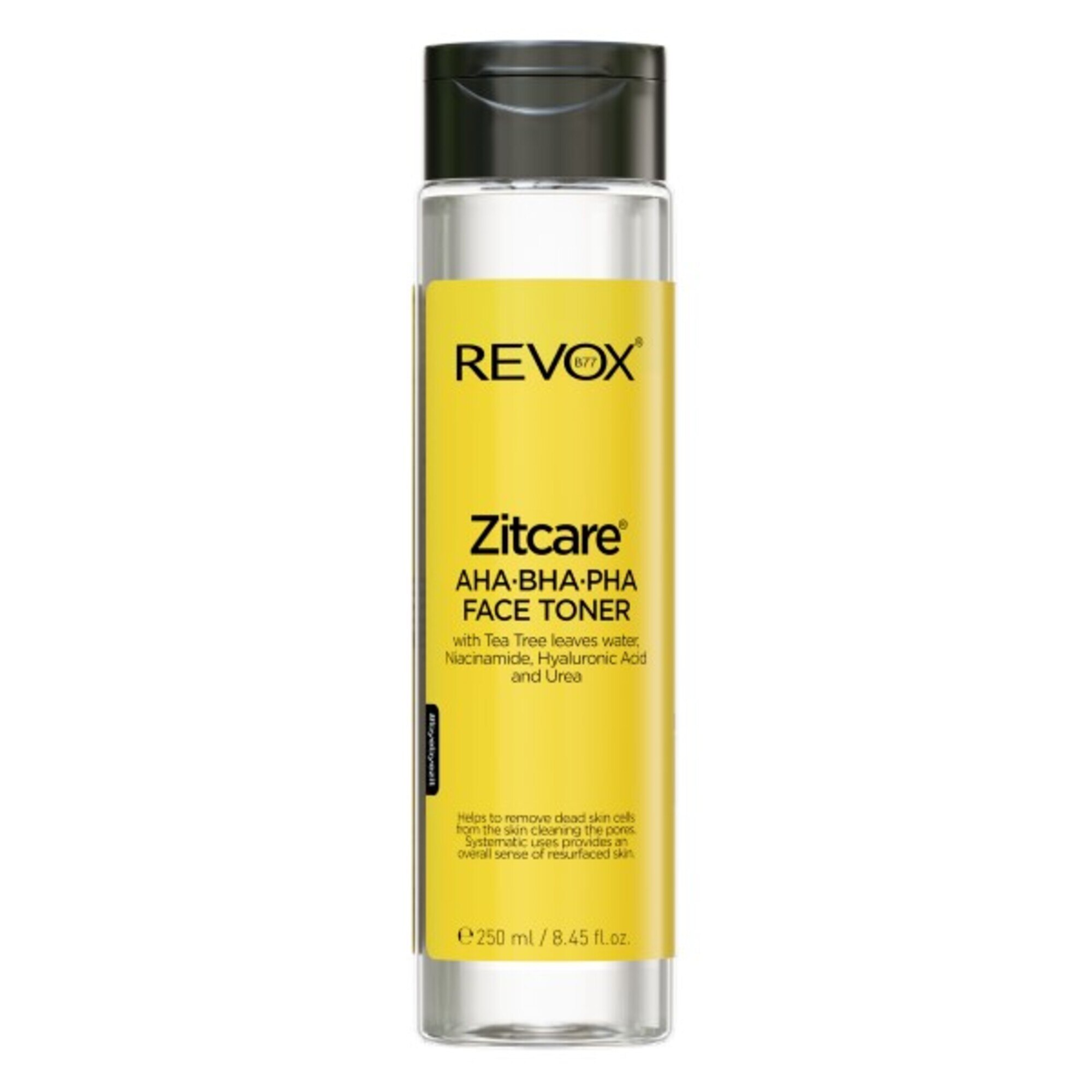 Tonerul delicat pentru față conține un mix de AHA, BHA și PHA, care ajută la îndepărtarea celulelor moarte de la suprafața pielii și la curățarea porilor. Extractul de arbore de ceai din formulă are proprietăți calmante, care actionează pentru a destinde și revigora pielea. Niacinamida ajută la protejarea pielii împotriva deshidratării si la refacerea acesteia. Acidul hialuronic și ureea confera pielii un aspect neted și catifelat. Utilizarea frecventă a produsului ajută la refacere a pielii. Combinați cu alte produse din linia REVOX B77 ZITCARE® pentru a obține rezultate maxime.
